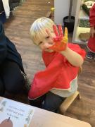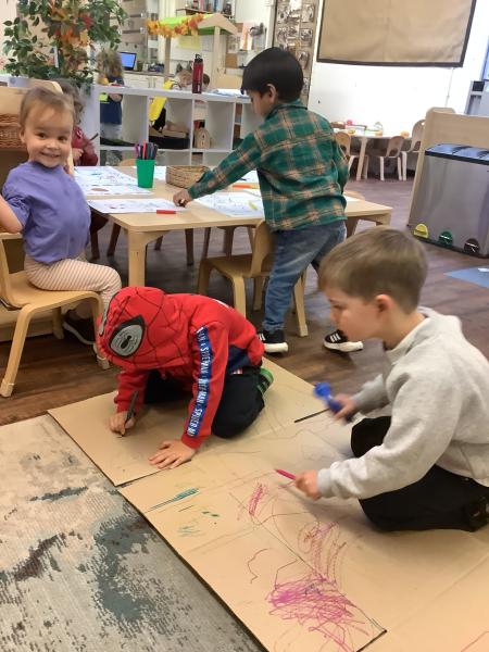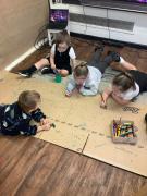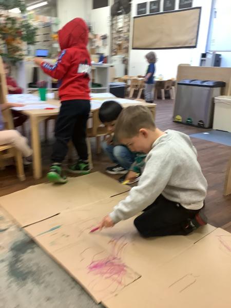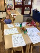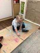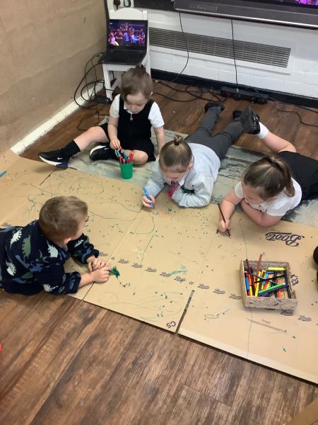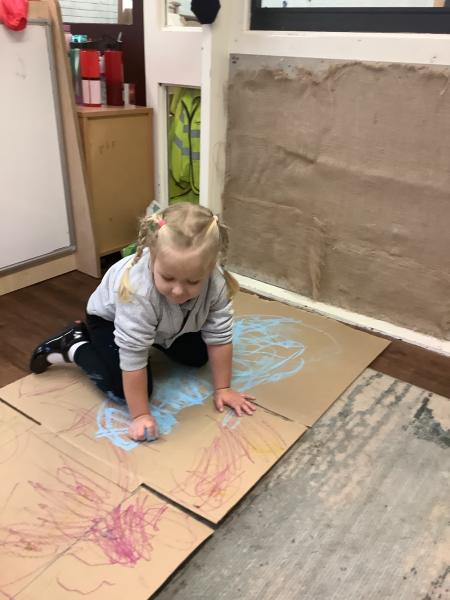 We love making marks using a variety of tools, from large marks on the floor to more controlled marks using coloured pencils and paint.